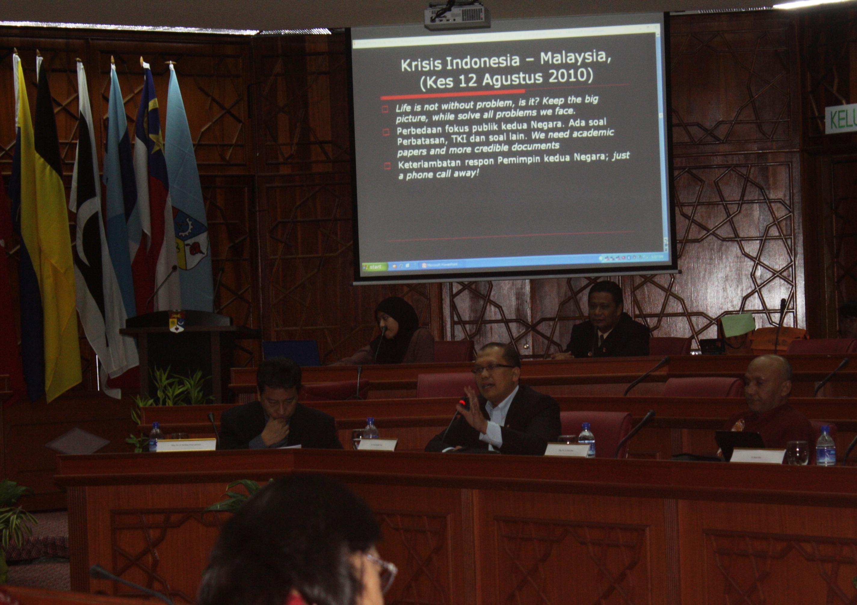 Beres belanja langsung meluncur kembali ke FSKK dengan rute sama. Masih dapat sesi Forum “kerjasama Dua Hala Indonesia – Malaysia. Menarik juga mengamati diskusi puncak ini. Dari pihak Indonesia diwakili Prof. Dr. Bambang Shergi Laksmono, Dr. Muklis Yusuf, Prof. Dr. Erman Anom, dan Dr Musni Umar. Walaupun diskusi berangsung panas karena menyajikan data dan argumentasi dari dua sudut dan kepentingan berbeda, namun tetap bersahabat. Dr. Muklis misalnya memberi terobosan tawaran seperti Universitas sebagai pusat pengkajian persoalan Indonesia – Malaysia dan ia juga menawarkan agar Duta Besar Malaysia untuk Indonesia mau berkunjung ke media massa, redaksi dan pemiliki media. Kegiatan ini menjadi penutup kegiatan sebumi dengan kata-kata penutup dari pihak UKM dan UI.