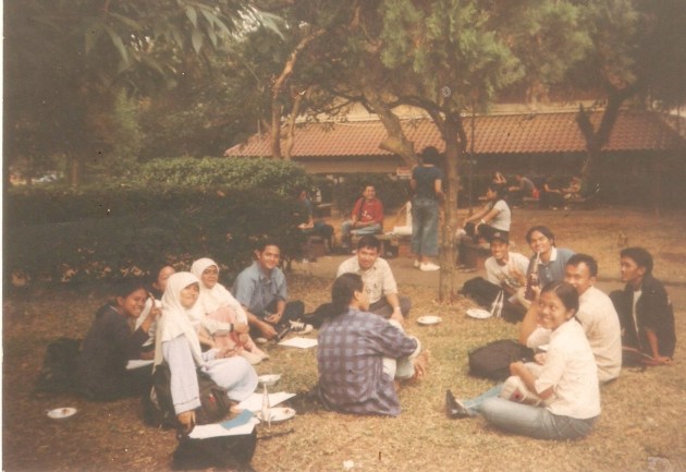 hmm hal yang menarik waktu itu, kadangkala rapat memang diadakan di luar ruang, sambil traktiran rujak atau setidaknya minum teh botol. Suasana lebih asyik walaupun materi yang dibahas seringkali amat serius. Rapat diatas dilakukan di atas hamparan rumput sebelah fotocopy penjara.