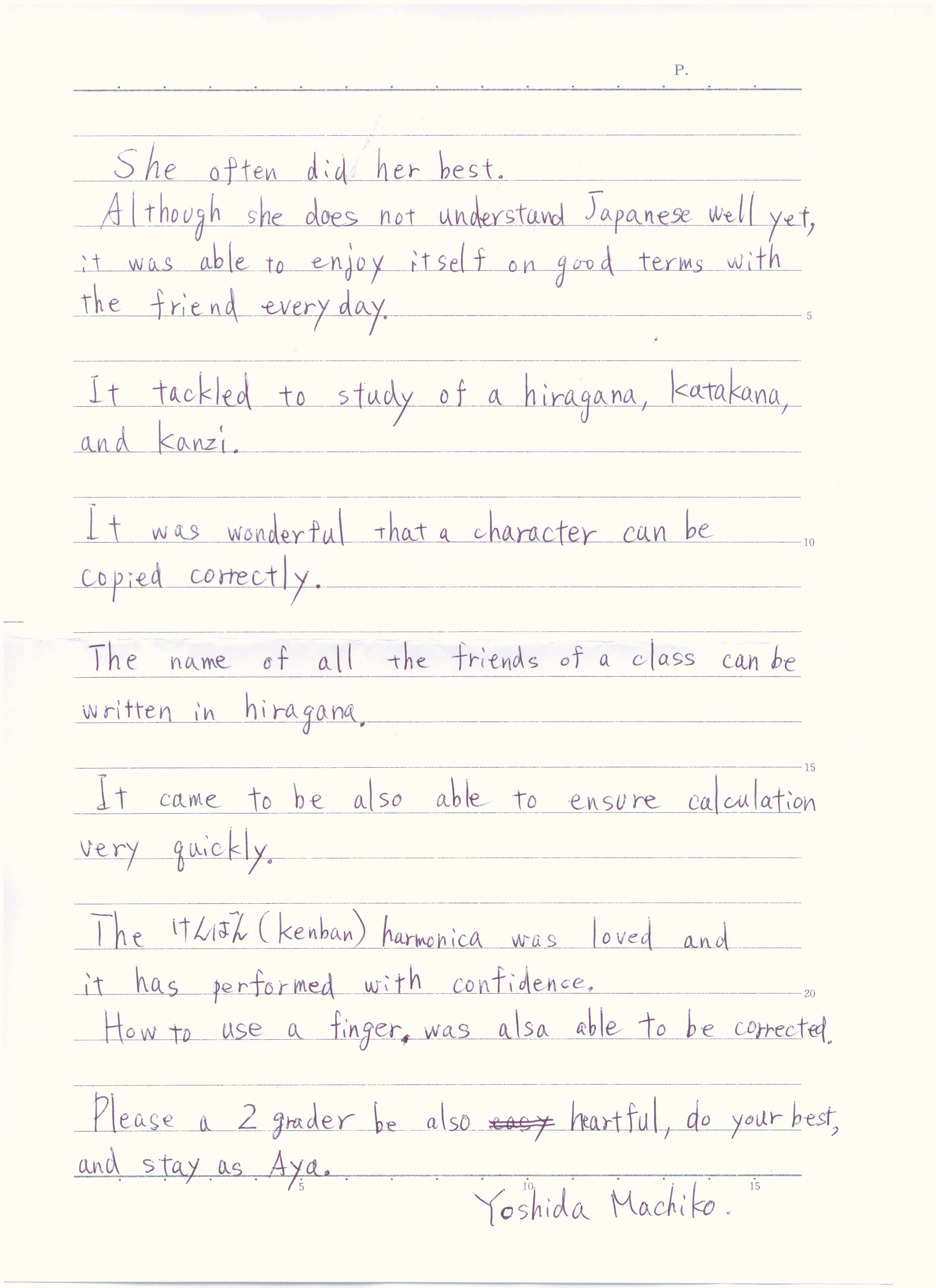 Beberapa waktu lalu Ayu menerima raport. Raportnya dalam bahasa Jepun. Namun Sensei-nya menuliskan dalam bahasa Inggris untuk Ayu. Silahkan dibaca isinya: