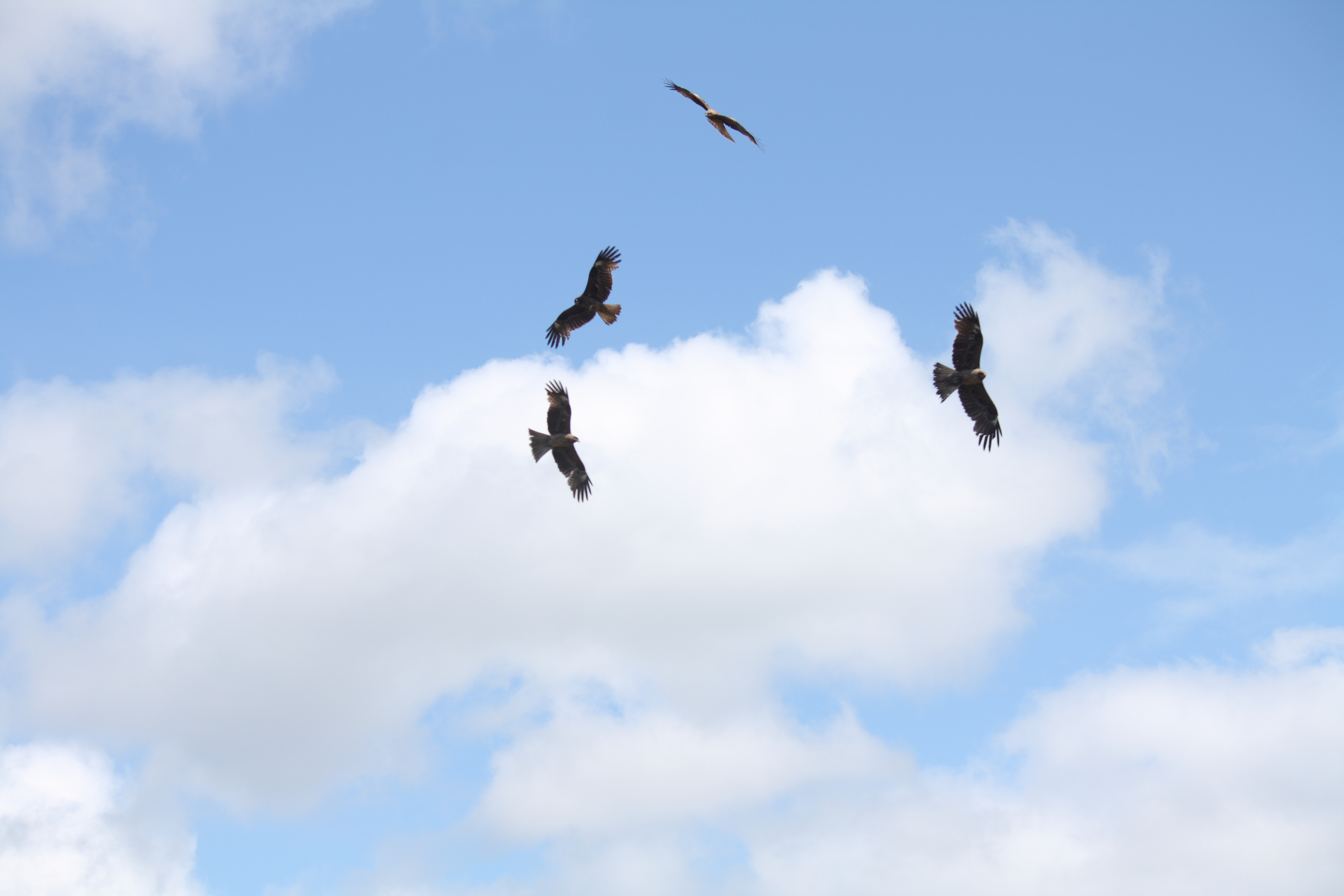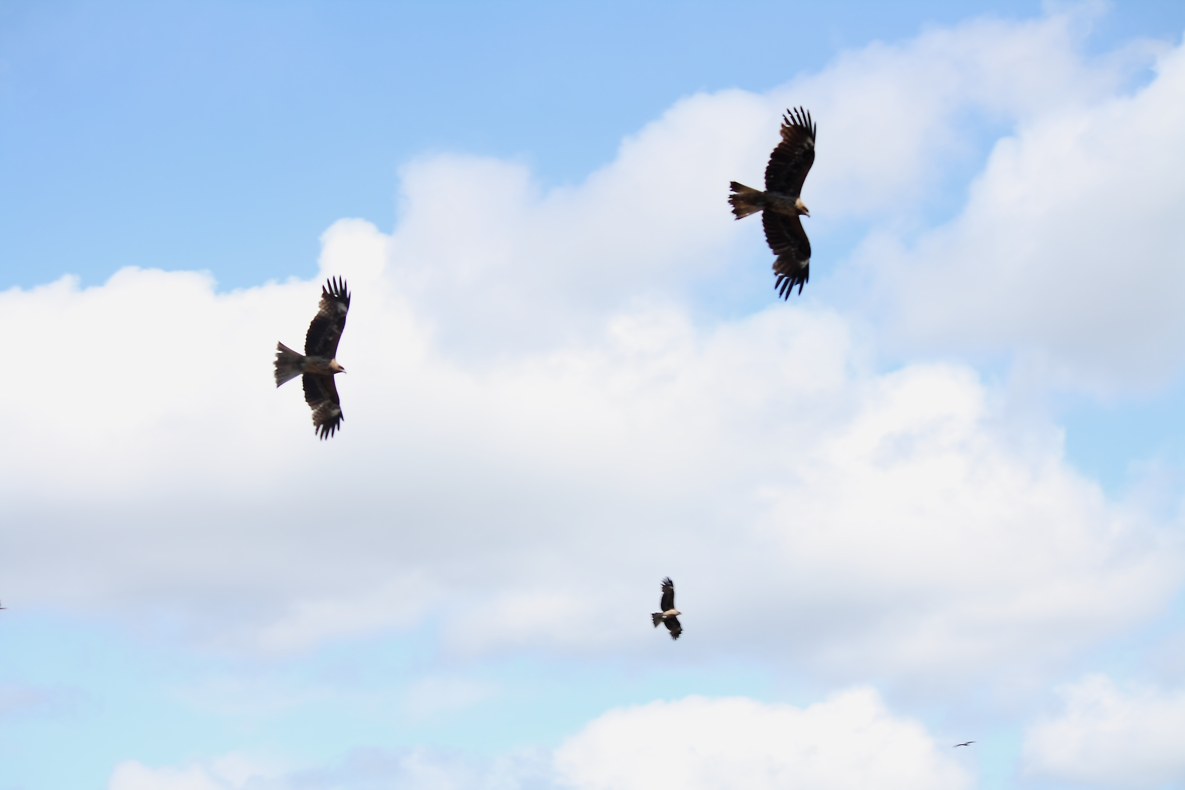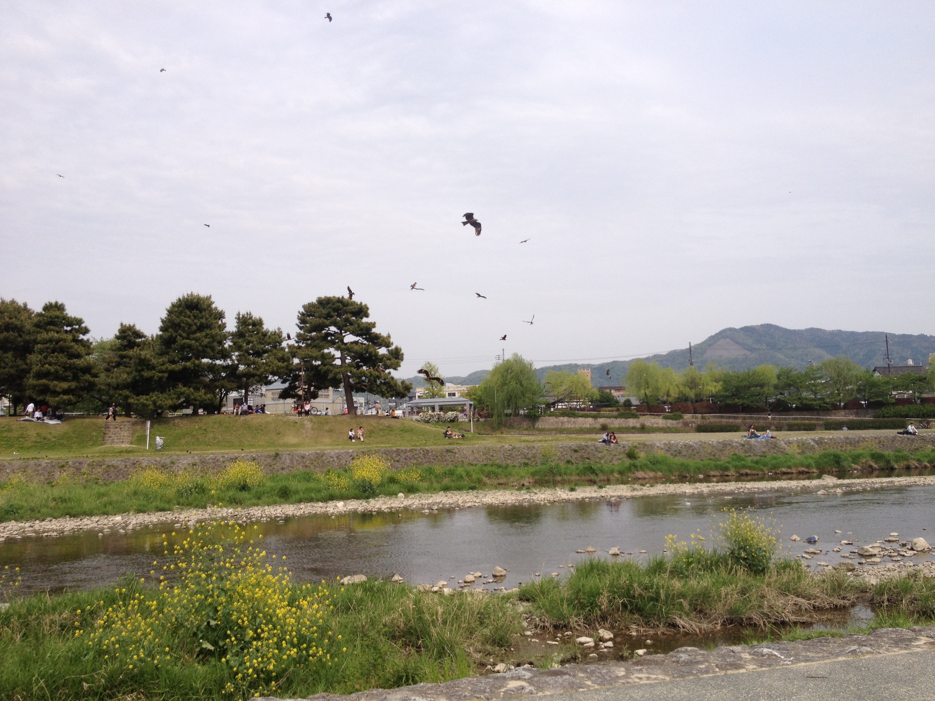 Elang nampaknya kasta tertinggi di sungai kamo. Mereka nampaknya berposisi sebagai bos di kawasan tersebut. Celakanya perilakunya seperti geng motor saja, bergerombol dan tak segan memukuli hewan lain yang lebih lemah seperti gagak. Pun elang sungai Kamo memiliki kebiasaan merampas makanan milik orang-orang yang makan siang.