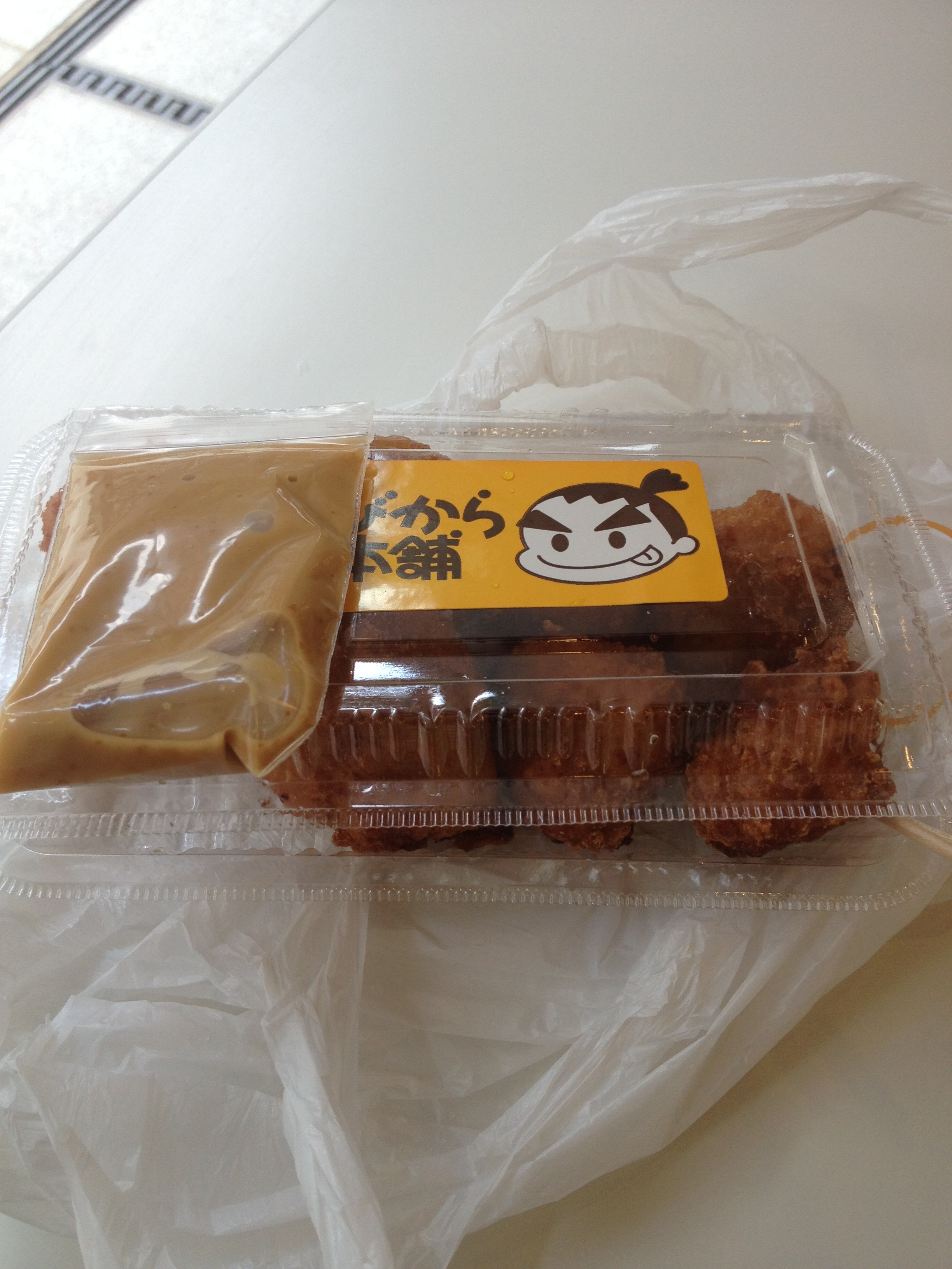 Hmm, ada makanan enak dan murah kesukaan keluarga kami. Kami menyebutnya karage idola, he he. Jualannya di kios kecil di pasar demachiyanagi yang setiap hari kalau ke kampus pasti lewat. Jadi kadang-kadang bawa bento cuma nasi dan sayur, lauknya beli disini. Rasanya, ueeeeenak. favoritku karage kecil-kecil pake saus goma. Hmm jadi lapar