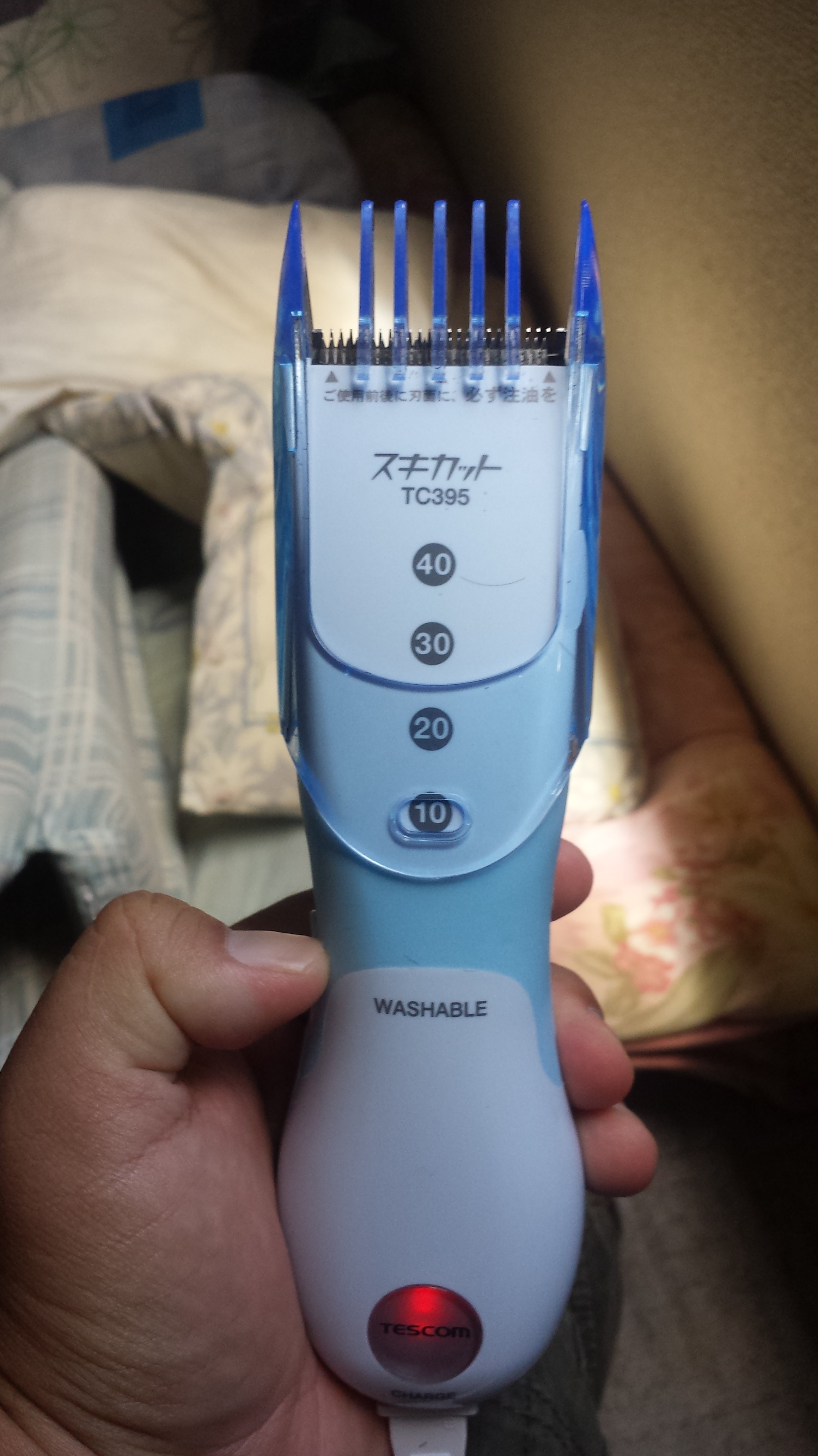 Di Kojima Shop, akhirnya kami mendapatkan alat cukur yang sepertinya mudah digunakan seharga sekitar 2900 yen. Alatnya seperti alat tukang cukur, namun nampak lebih praktis. Selain memakai batere yang bisa dicharge, ada pilihan instan semacam memotong rambut dengan ukuran 10mm, 20mm, 30mm dan 40mm. Guntingnya dilindungsi semacam plastik sehingga dijamin tak melukai kulit kepala. Alat ini juga bisa dicuci (washable). Ini dia penampakannya: