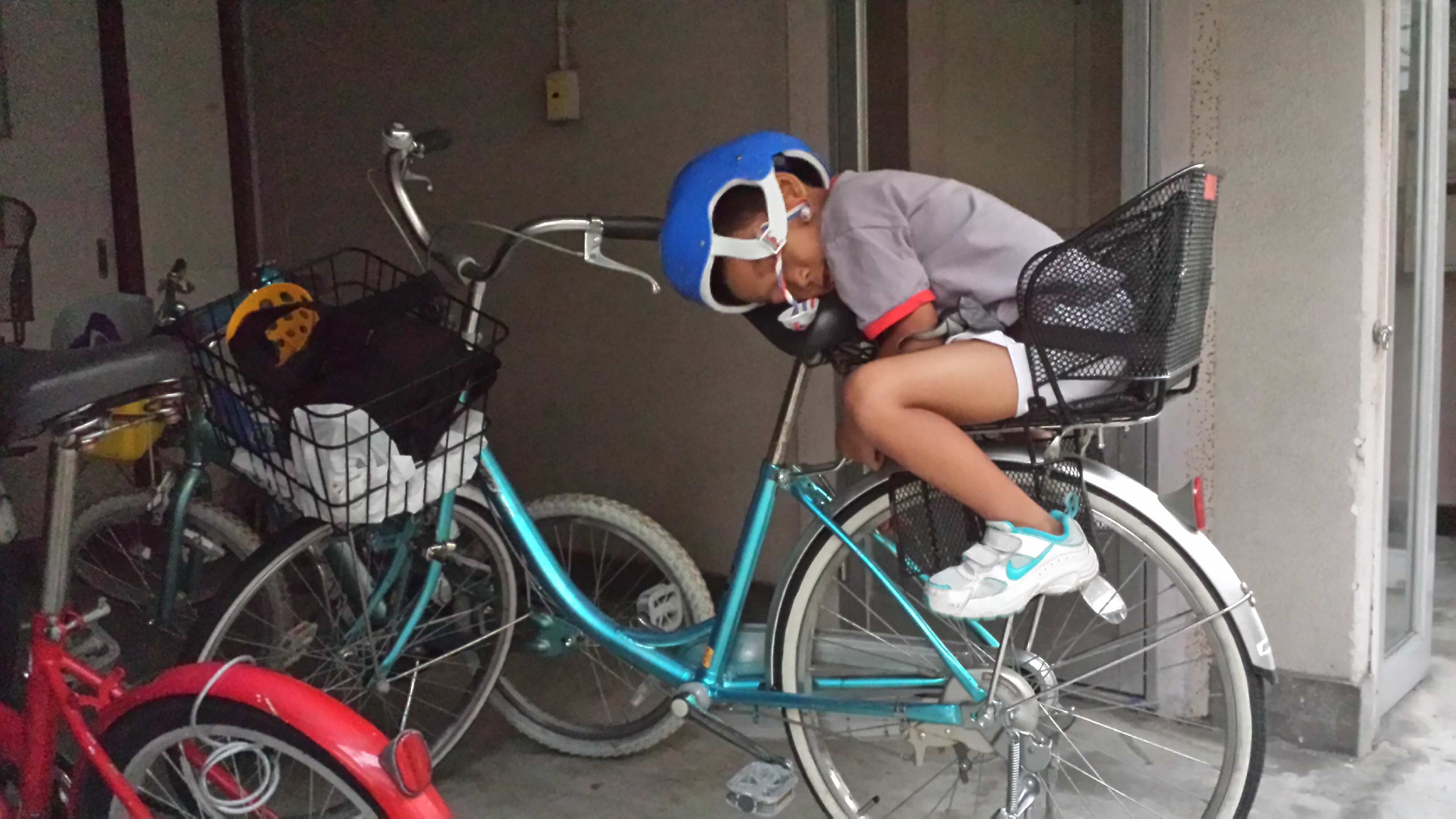 Kadangkala karena terlalu mengantuk, Ilham tertidur di boncengan. Untunglah pake sabuk pengaman, jadinya aman. Dus, boncengannya juga didesain khusus lho, a la Jepun.