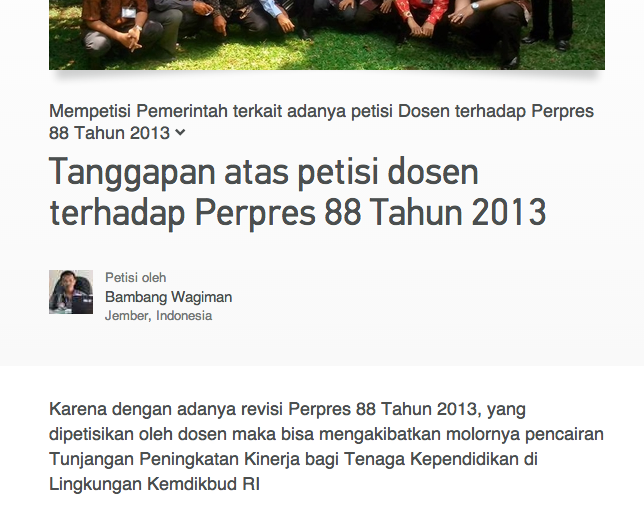 Karena dengan adanya revisi Perpres 88 Tahun 2013, yang dipetisikan oleh dosen maka bisa mengakibatkan molornya pencairan Tunjangan Peningkatan Kinerja bagi Tenaga Kependidikan di Lingkungan Kemdikbud RI