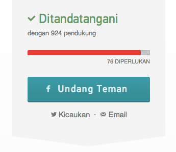 Alhamdulillah setelah dilaunching hari selasa lalu, sudah cukup banyak pendukung petisi untuk merevisi Perpres 88 tahun 2013 dan Perpres 65 tahun 2007. Sampai satu menit lalu, sudah 924 orang, tinggal 76 lagi menuju 1000.