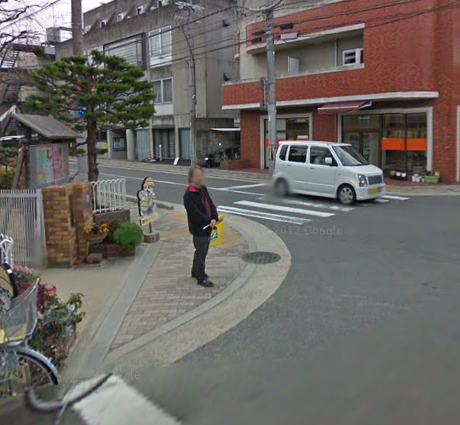 Nah, penampakan si Bapak Kepala sekolah yang oleh Ilham dipanggil Encho Sensei tersebut terekam di street view google depan sekolahnya, lagi mengatur lalu lintas pagi-pagi. Ini saya capture-kan gambarnya.
