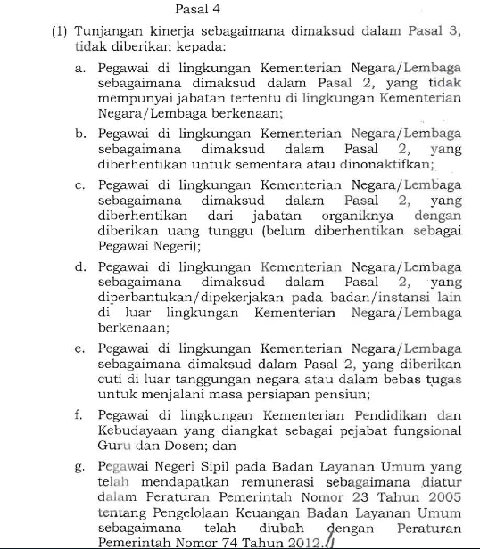 Pasal 4 (1) f: teramat sangat mendiskriminasi Guru dan terutama Dosen di Kemendikbud, secara eksplisit disebutkan nama kementeriannya Kemendikbud juga ikut didiskriminasi, selain jabatan fungsionalnya Guru dan Dosen Perlakuan berbeda sekali pada Kementerian Negara/Lembaga lainnya yang diperlakukaan sama baiknya seperti pada butir a, b, c, d, e. Padahal 26 K/L tersebut juga ada PNS yang menjabat fungsional Dosen. Diskriminasi PNS Dosen Kemendikbud. Bukankan begitu pak???