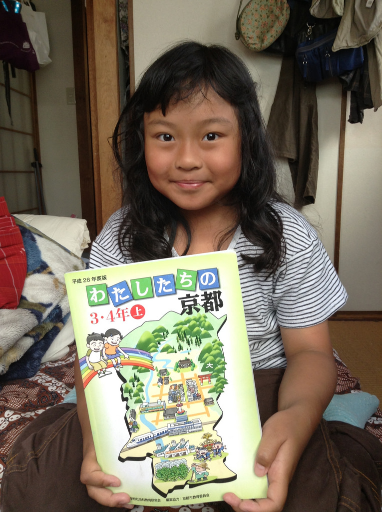 Lain hari Ayu cerita, untuk pelajaran IPS ia mesti berkeliling lingkungan sekitar sekolah untuk mencatat apa saja yang ada, dan kemudian membuat peta kawasan sekolahnya dan juga mewawancara orang dengan profesi tertentu. Ayu kebagian wawancara kasir di Family Mart. Oh ya, ini dia buku pelajarannya, kata Ayu IPS nya khusus tentang Kyoto saja, mungkin semacam Mulok begitu.