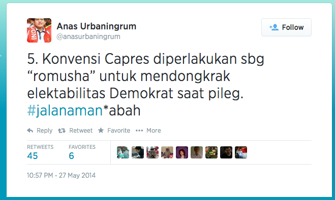 Kesimpulan sederhananya adalah, SBY membunuh Konvensi Calon Presiden di Partai Demokrat karena sebetulnya diam-diam memberi sokongan terhadap Prabowo-Hatta. Konvensi Demokrat bukan ajang melejitkan para peserta malah membunuh karir politik mereka. Dengan mengikuti konvensi, para bakal calon presiden dikerangkeng sehingga tidak bisa melakukan pendekatan kepada calon Presiden manapun di luar Demokrat. Padahal konvensi diikuti dengan sepenuh hati dan tenaga serta tentu saja materi oleh para pesertanya. Dua tokoh muda, Dino dan Gita misalnya, memasang iklan kampanye di layar jaringan bioskop 21 (Please deh, ini ganggu mood waktu nonton The Raid 2 Berandal). Anies Baswedan membangun jaringan relawan turun tangan sebagai penyokong. Dahlan Iskan, menggunakan jaringan media yang ia miliki untuk mendongkrak popularitasnya. Namun hanya pepesan kosong yang didapatkan oleh Dahlan ketika ia memenangkan konvensi. Mahkota tanpa makna apa pun. Tak heran bila Anas mengatakan dalam tweetnya  “Konvensi Capres diperlakukan sbg “romusha” untuk mendongkrak elektabilitas Demokrat saat pileg”.