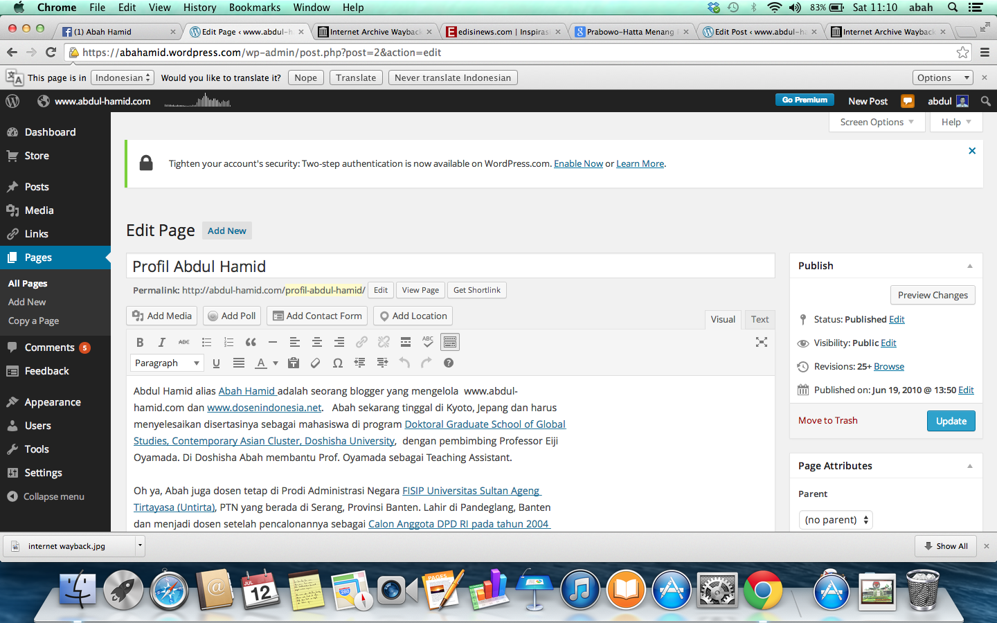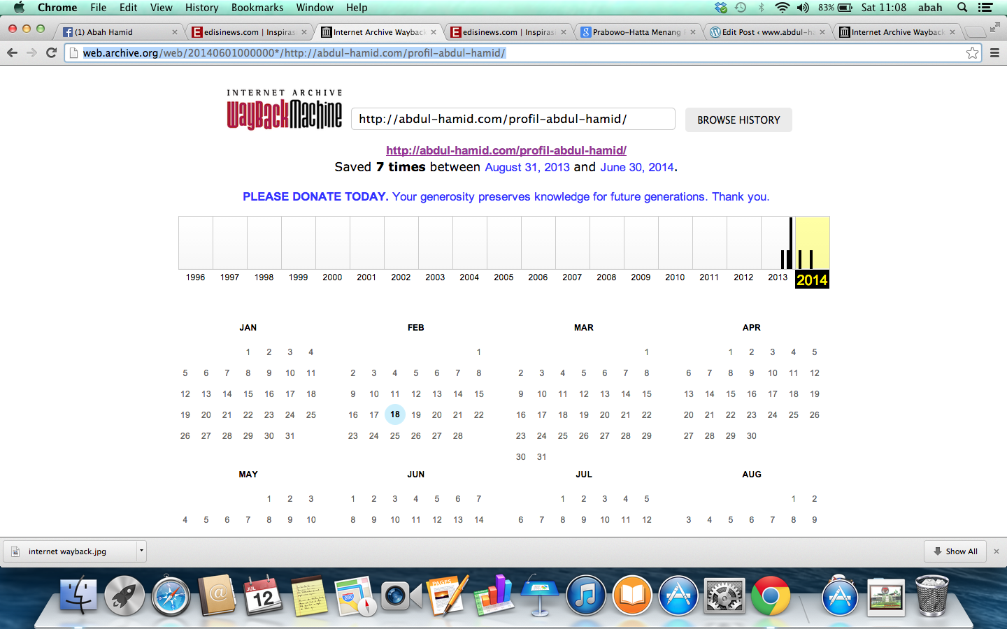 Tertera saya melakukan upload (publish) pertama kali pada tanggal 19 Juni 2010 dengan perubahan sebanyak 25 kali (narsis yah gw) . Padahal http://archive.org/web/ menunjukkan “rekaman pertama” terhadap halaman tersebut pada 31 Agutus 2013 dan hanya ada 7 kali perubahan. Bahkan perubahan tanggal 4 Juli saja tidak terekam di http://archive.org/web/. Jika anda blogger, anda bisa melakukan uji coba yang sama.