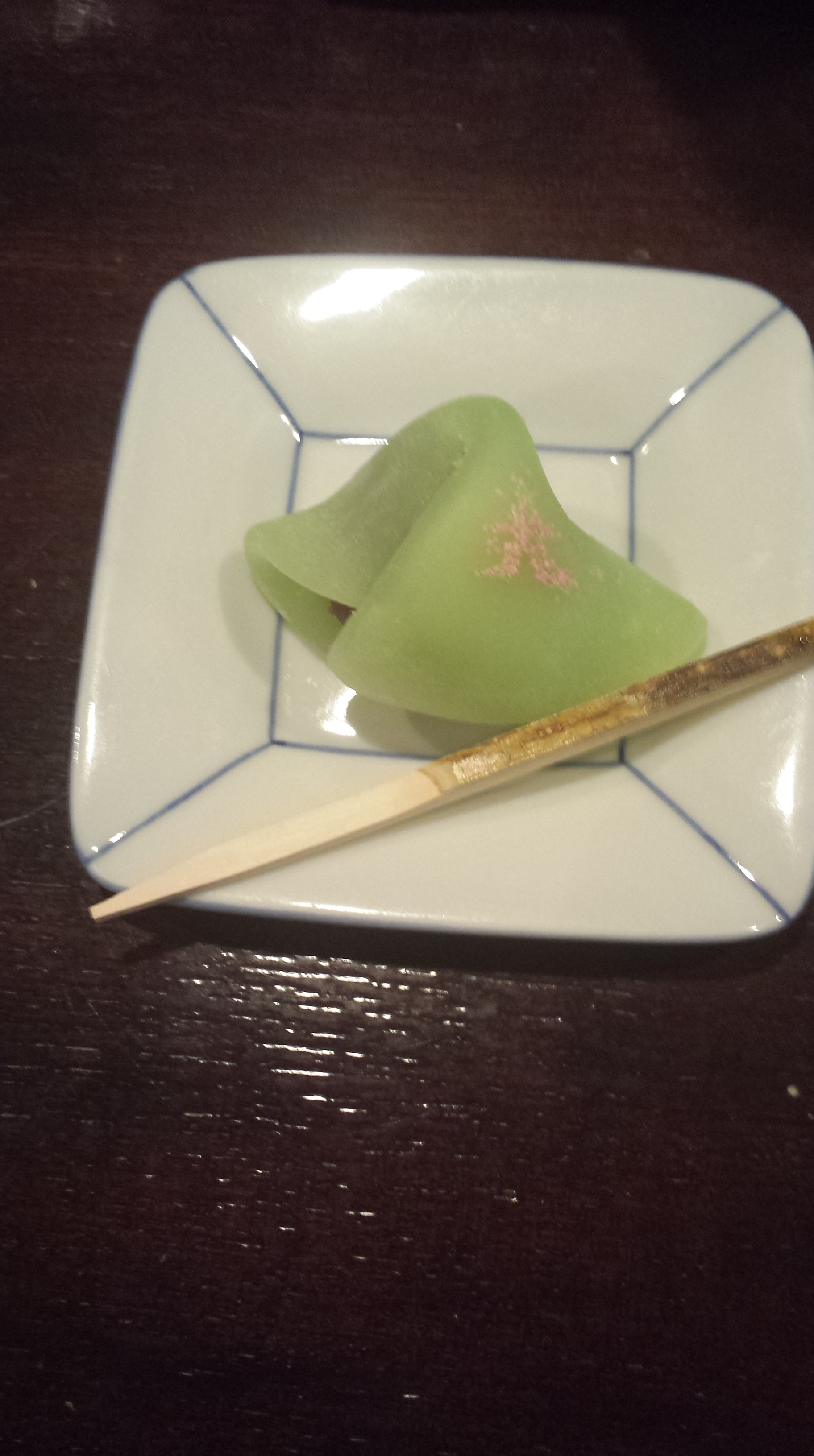 Kue pertama dinikmati di kedai teh ippodo. Bentuknya seperti Gunung Daimonji, lengkap dengan kanji Dai (大)
