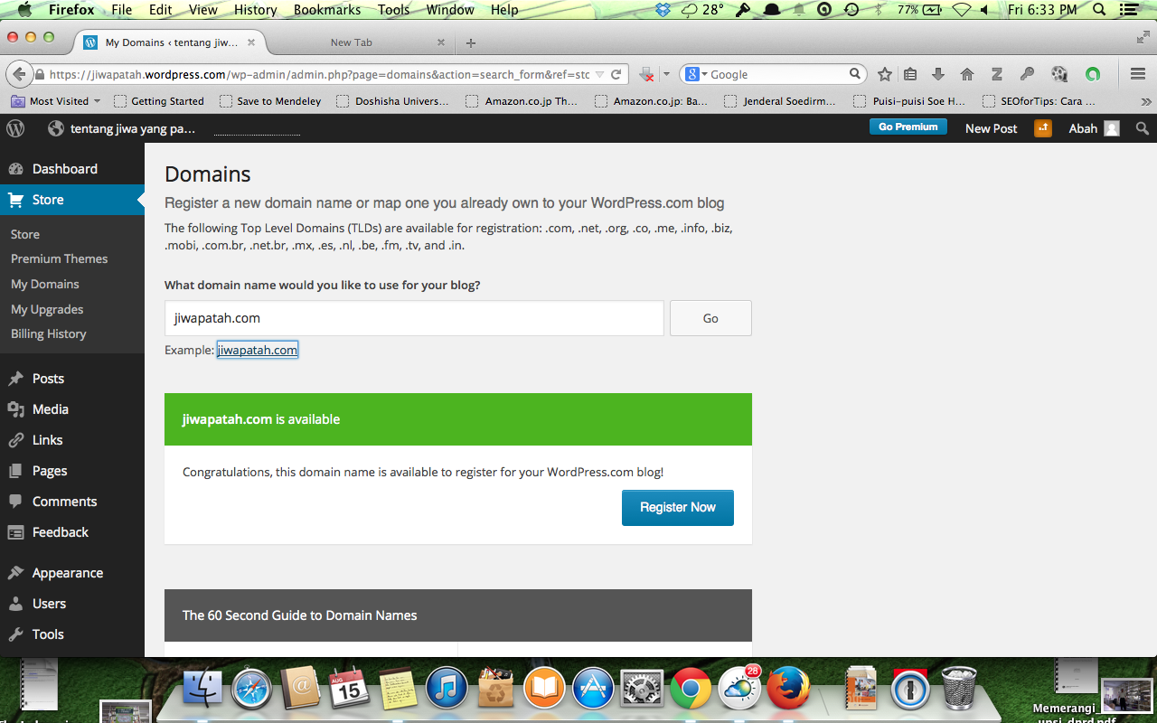 Setelah itu memilih nama domain yang diinginkan, tentu saja ada beberapa pilihan. Saya coba jiwapatah.com