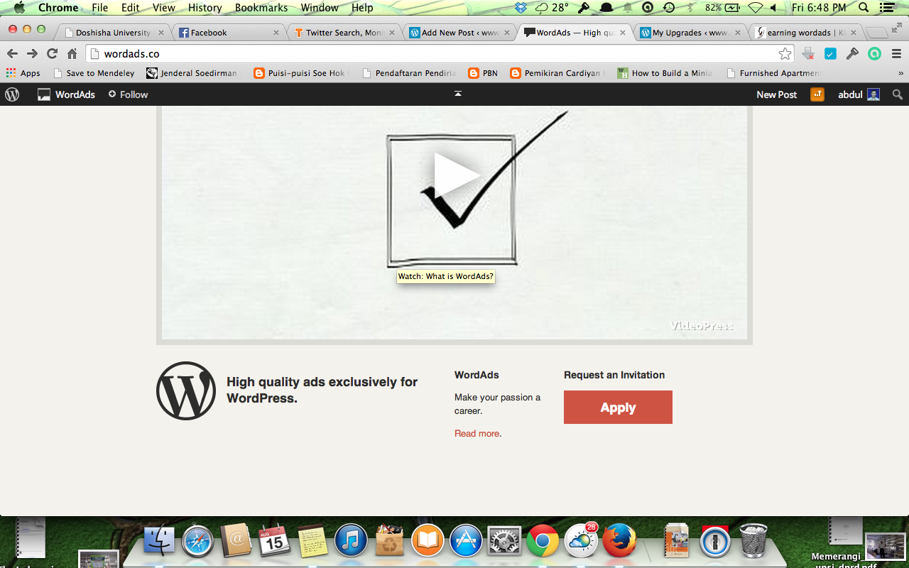 3. Jika proses di atas beres, maka sebetulnya anda sudah bisa mendaftar. Namun kabarnya, antrian WordAds cukup panjang, jadi sebaiknya anda isi dengan teratur sekitar sebulan (kamsudnya kalau bisa menargetkansatu posting sehari dalam blog dalam sebulan) dan lakukan search engine optimization (seo) agar blog anda memiliki pengunjung yang lumayan dan stabil.
