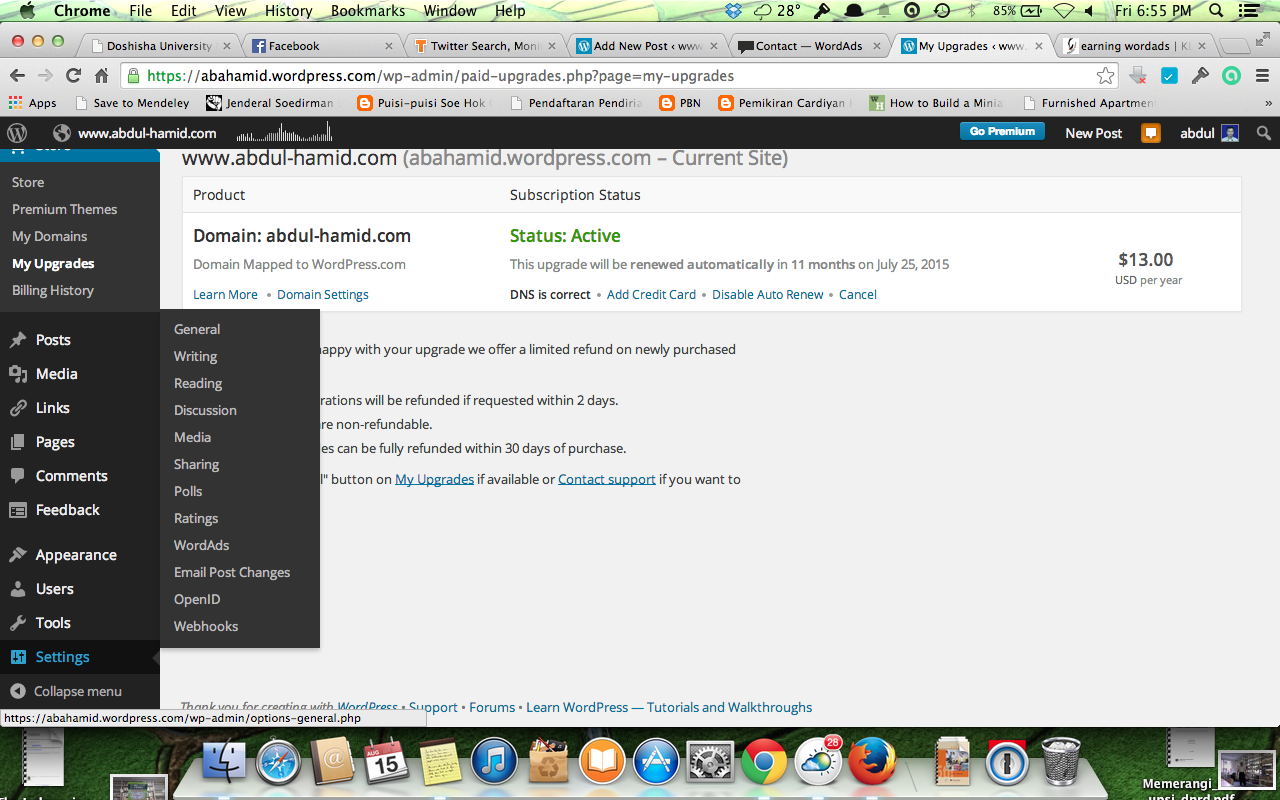 kalau anda membeli domain di tempat lain, namun melakukan mapping di wordpress.com. berarti tinggal klik “Map a domain you already own” di gambar ke-4 (dari atas) dan biaya pertahunnya 1300 yen saja. Sebagai contoh, saya membeli domain http://www.abdul-hamid.com di tempat lain, namun melakukan mapping di wordpress.com.