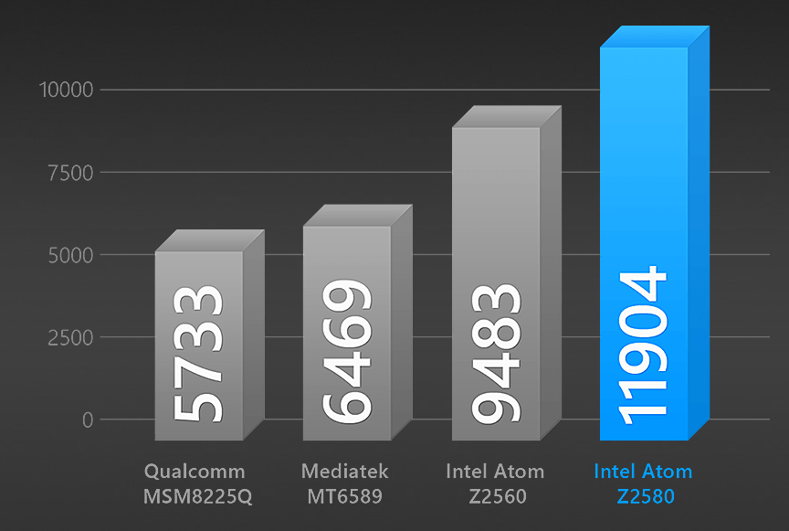 Memorynya yang 64-bit juga memastikan kinerjanya bisa lebih cepat dua kali lipat. Belum lagi prosessor intel ® Atom ™ 2580 membuat smartphone ini unggul ketika diuji AndEBench CPU Benchmark.
