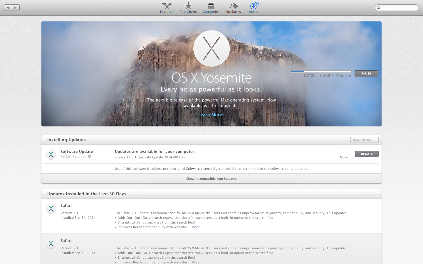 Habis terinstall dengan sempurna, saya masuk kembali ke appstore untuk melakukan update terhadap beberapa aplikasi bawaan: pages, keynote, numbers dan itunes.
