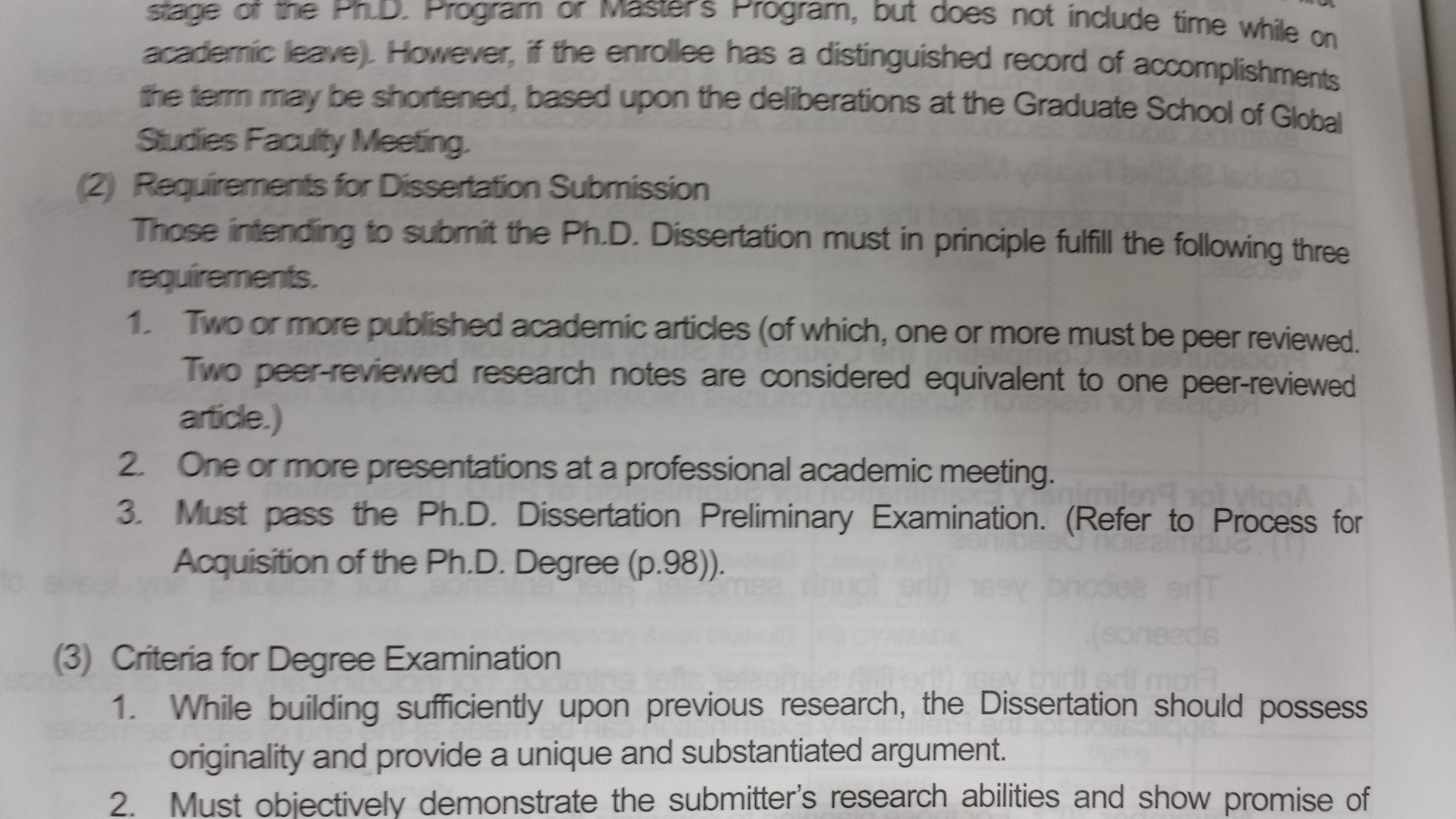 Di Jepun, biasanya kampus menetapkan standar jumlah publikasi jurnal sebagai syarat mengikuti ujian terbuka (defense). Doshisha University sendiri menetapkan minimal dua jurnal (satu mesti peer reviewed jurnal) dan satu presentasi di professional academic meeting.
