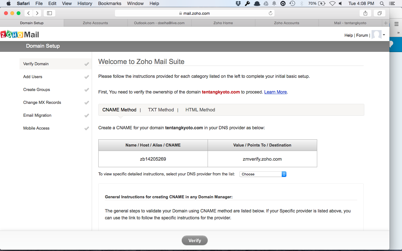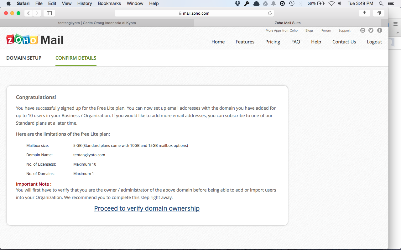 3. Pilih mail, ada beberapa pilihan, pilih yang “lite”, karena gratis, mendapatkan 5Gb dan 10 user. Kemudian klik verify domain untuk memverifikasi pemilikan domain/website anda.