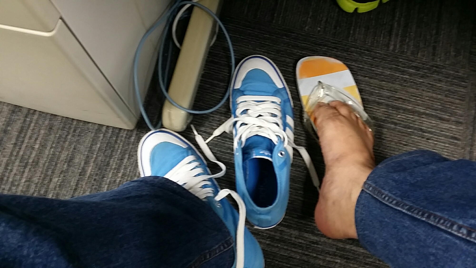 Ya entah kenapa begitu sampai meja kerja, saya punya kebiasaan lepas sepatu dan kaos kaki, ganti sama sendal jepit. Rasanya semriwing agak gimana gitu. Celakanya kebiasaan ini terbawa juga kalau nyetir, mesti copot sepatu atau sendal gitu. Kalau ndak ya gak mantap gitu.