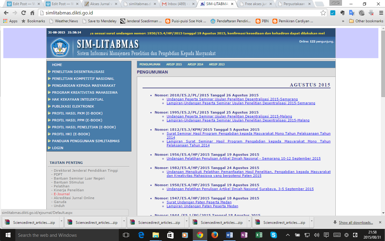 - Masuk ke http://simlitabmas.dikti.go.id/, klik e-journal