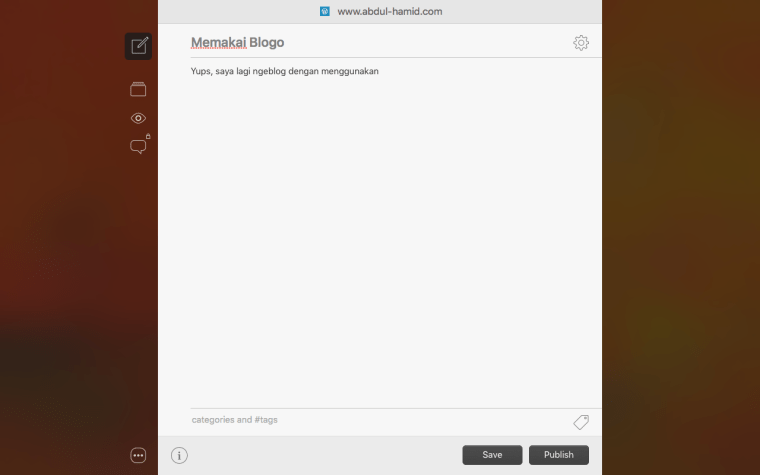 Yups, saya lagi ngeblog dengan menggunakan blogo, sebuah aplikasi yang terpasang di macbook. Antarmukanya oke, dengan dashboard yang membuat kita bisa fokus menulis.