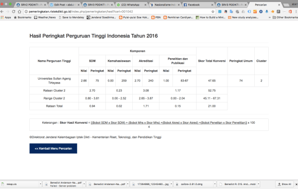 Baru-baru ini Kemenristekdikti mengeluarkan pemeringkatan perguruan tinggi di Indonesia di http://pemeringkatan.ristekdikti.go.id/index.php/. Nah mencarinya mesti memasukkan kode perguruan tinggi dari PDDIKTI. Saya sempat kesulitan mencarinya, ketemu di http://forlap.ristekdikti.go.id/perguruantinggi/homerekap/NTM1QzA4QzYtNzMyMS00RjdFLThCMzktQ0E1NzdDOTk3MDRF/0 Klik PTN atau kopertis, maka […]