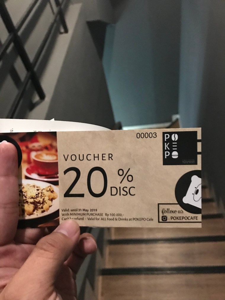 Nah yang menarik tentu saja diskon. Ada diskon 10% jika posting dan follow akun instagram pokepo. Ditambah cashback 20% jika bayar pake go pay. Hanya posting harus 30 menit sebelum print bill, jadi kali ini ndak dapet larena udah kemaleman. Nah begitu bayar masih dikasih kupon diskon lagi untuk kedatangan berikutnya sebesar 20%.