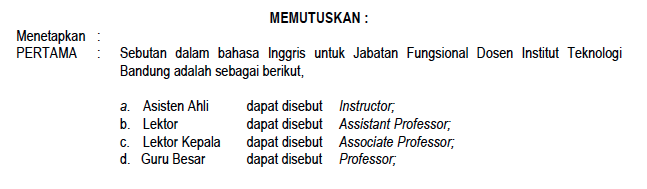 Lho darimana Associate Professor tersebut berasal? Sebenernya sih karena kebetulan lagi tugas belajar di luar negeri, jadi perlu istilah untuk menyebutkan posisi saya di kampus di Indonesia. Biasanya sih pake lecturer, tapi pengen yang agak aksi gitu. Nah, begitu cari-cari, nemu deh Surat KEPUTUSAN SENAT AKADEMIK INSTITUT TEKNOLOGI BANDUNG Nomor : 043/SK/K01-SA/2002 TENTANG SEBUTAN DALAM BAHASA INGGRIS JABATAN-JABATAN FUNGSIONAL DOSEN INSTITUT TEKNOLOGI BANDUNG.