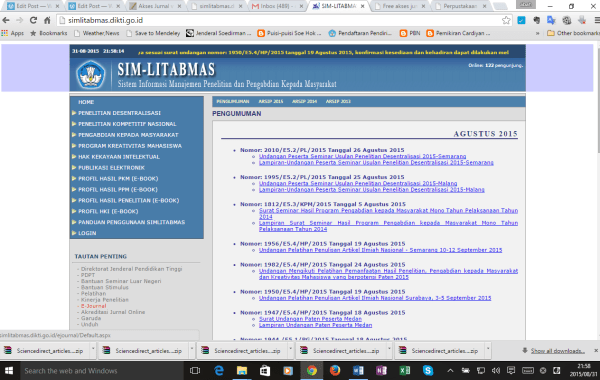 Selain melalui PNRI (Sila dibaca di sini), dosen ber-NIDN juga bisa mengakses jurnal melalui Simlitabmas Dikti. Walaupun terbatas hanya untuk jurnal di Proquest, Cengage dan EBSCO. Begini caranya: Masuk ke http://simlitabmas.dikti.go.id/, […]